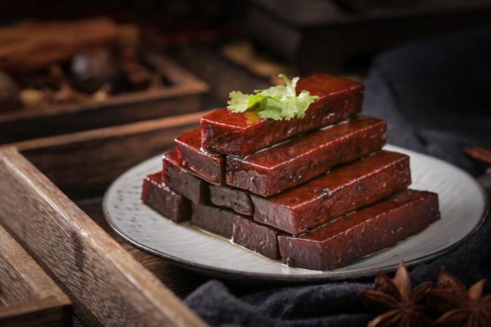 南溪豆腐干的制作历史悠久。相传诸葛亮途经南溪,品尝当地“金包玉”豆腐干后大为赞赏,将其定为军粮。“家家石磨声,满城豆干香”成为南溪独特的市井记忆。据《南溪县志》记载,南溪豆腐干的规模化制作与销售始于清末(1902年)。精选优质大豆,以“泡、磨、滤、煮、点、包、压、卤、烘”九道传统工艺,萃取大豆优质蛋白和营养精华,融合传统卤料芳香至味,成就了南溪豆腐干质地细腻、卤香醇厚、营养丰富的独特品质,奠定了其作为地理标志产品的品质根基。